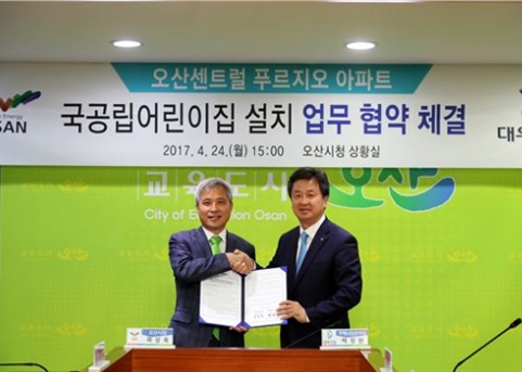대우건설, 오산 센트럴 푸르지오 단지 내 국공립어린이집 설치 대우건설이 내년 10월 입주예정인 '오산 센트럴 푸르지오' 단지 내 국공립어린이집을 설치한다.오산 센트럴 푸르지오 단지 내 국공립어린이집은 20년간 무상임대로 대우건설이 시공하며, 오산시가 운영 및 운영에 필요한 기자재비를 지원하는 형식이다. 대우건설은 지난 24일 오후 3시 오산시청 2층 상황실에서 대우건설 백정완 주택사업본부장, 곽상욱 오산시장 등이.. 2017.04.27