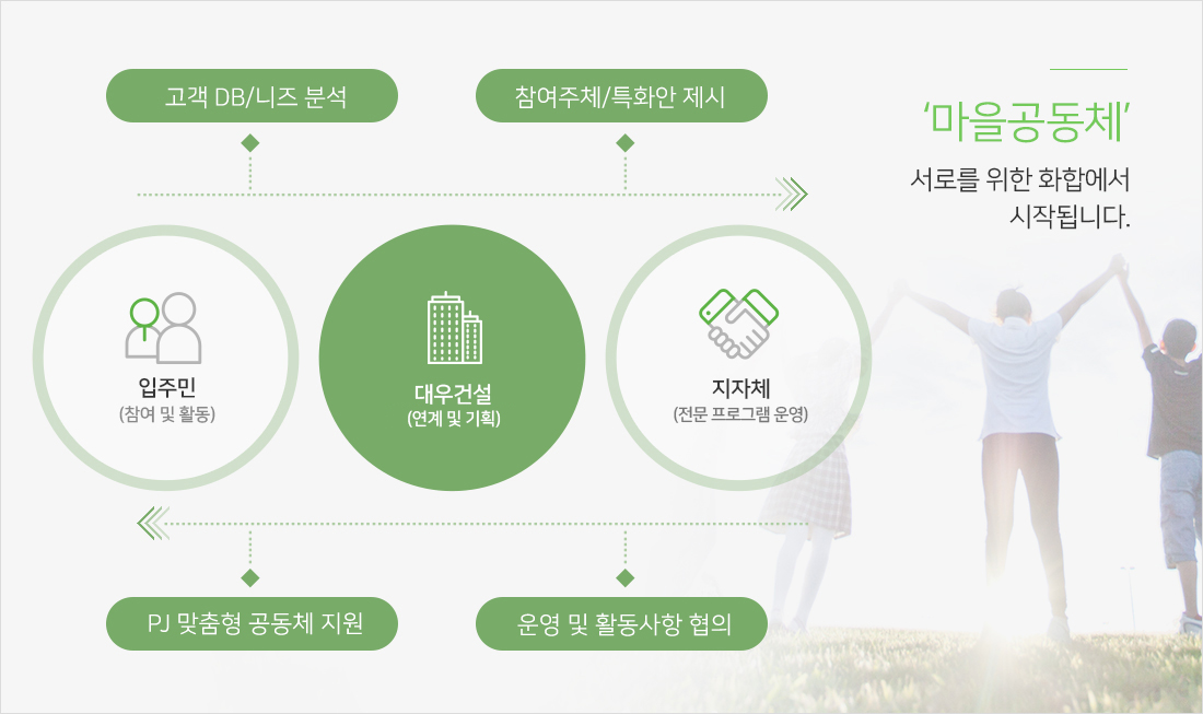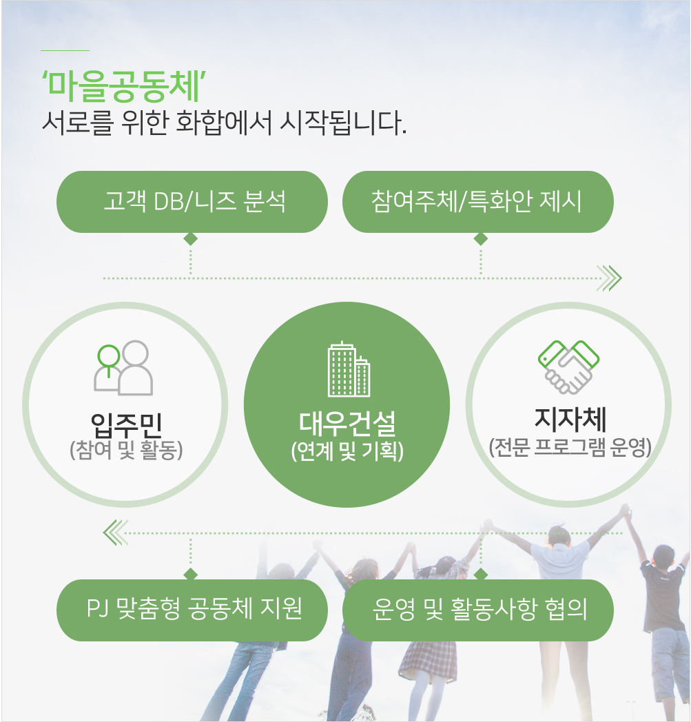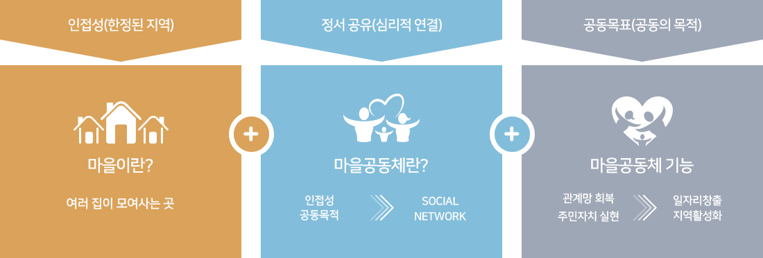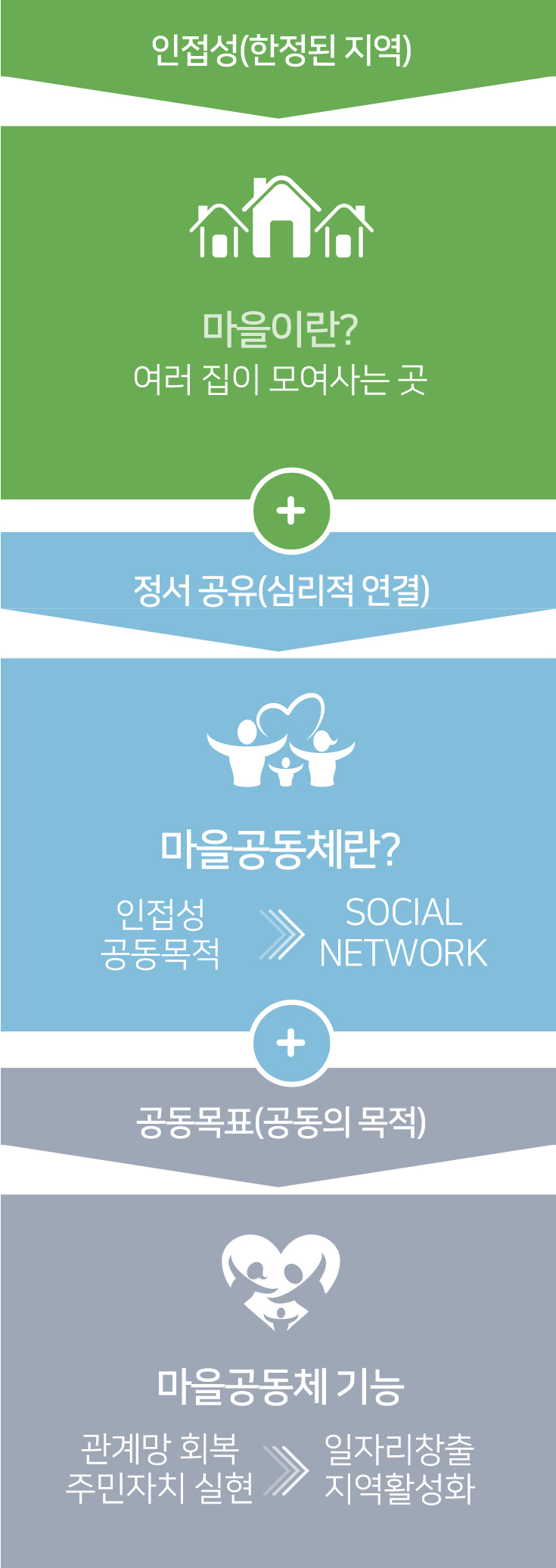 마을공동체는 주민들 자신이 속해 있는 ‘마을’과 관련된 일을 스스로 해결하고 결정하는 모임을 뜻합니다. 거주민이 필요로 하고, 기업이 지원하며, 대한민국이 함께 만들어갈 행복한 우리마을, 마을공동체입니다.