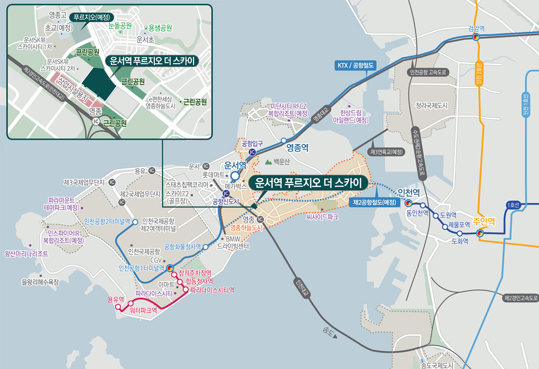 - 공항철도 운서역, 제2경인고속도로, 영종대교, 인천대교 등 광역교통망